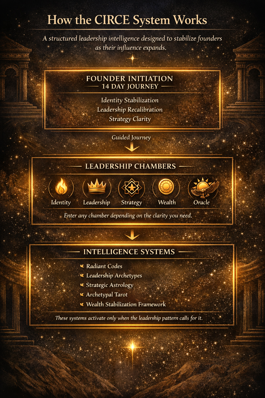• chamber access for identity, strategy, leadership, wealth and oracle reflection
